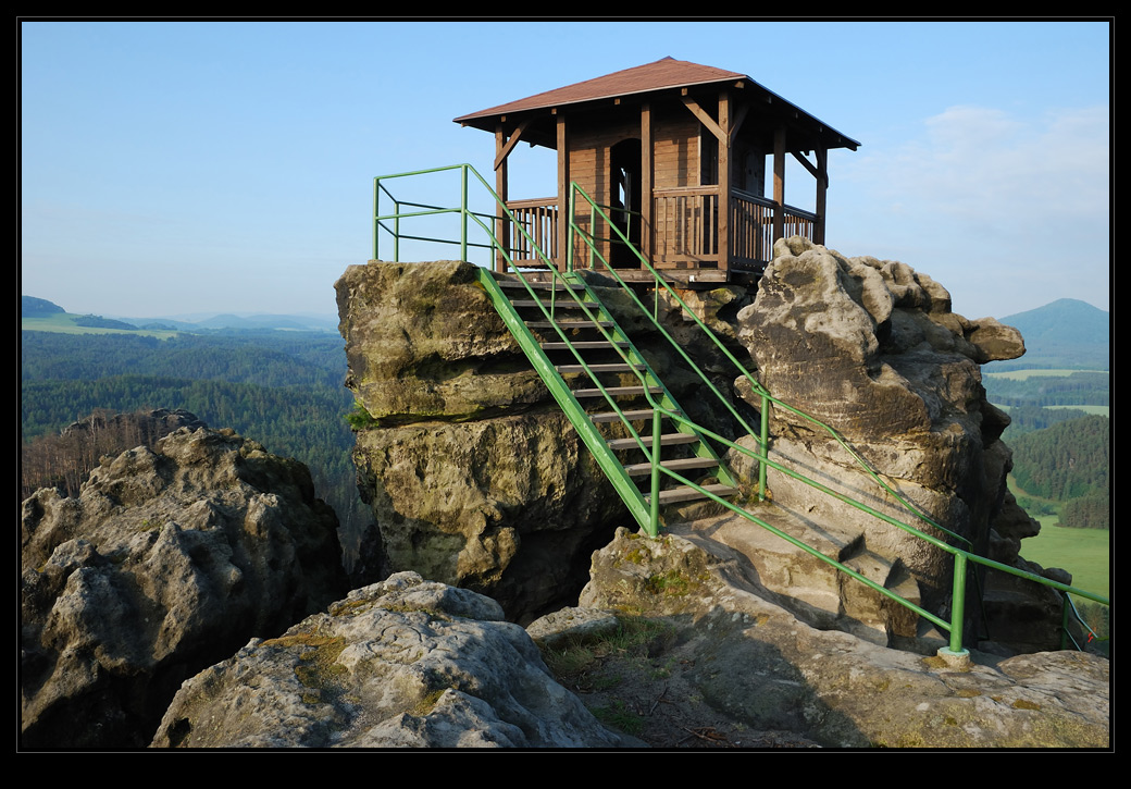 Šauštejn postavený na vysokých skalních blocích, turistická