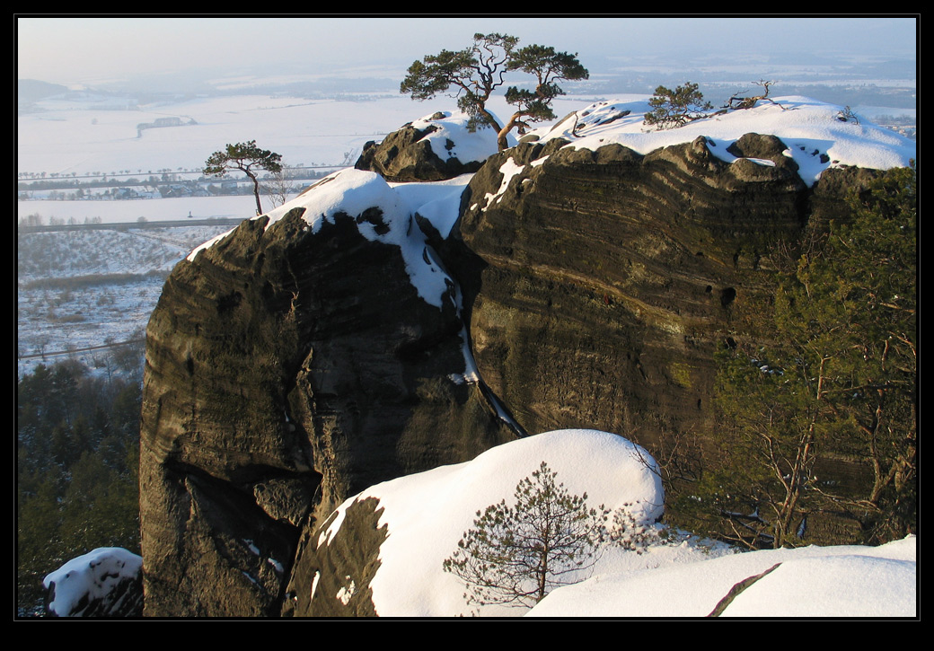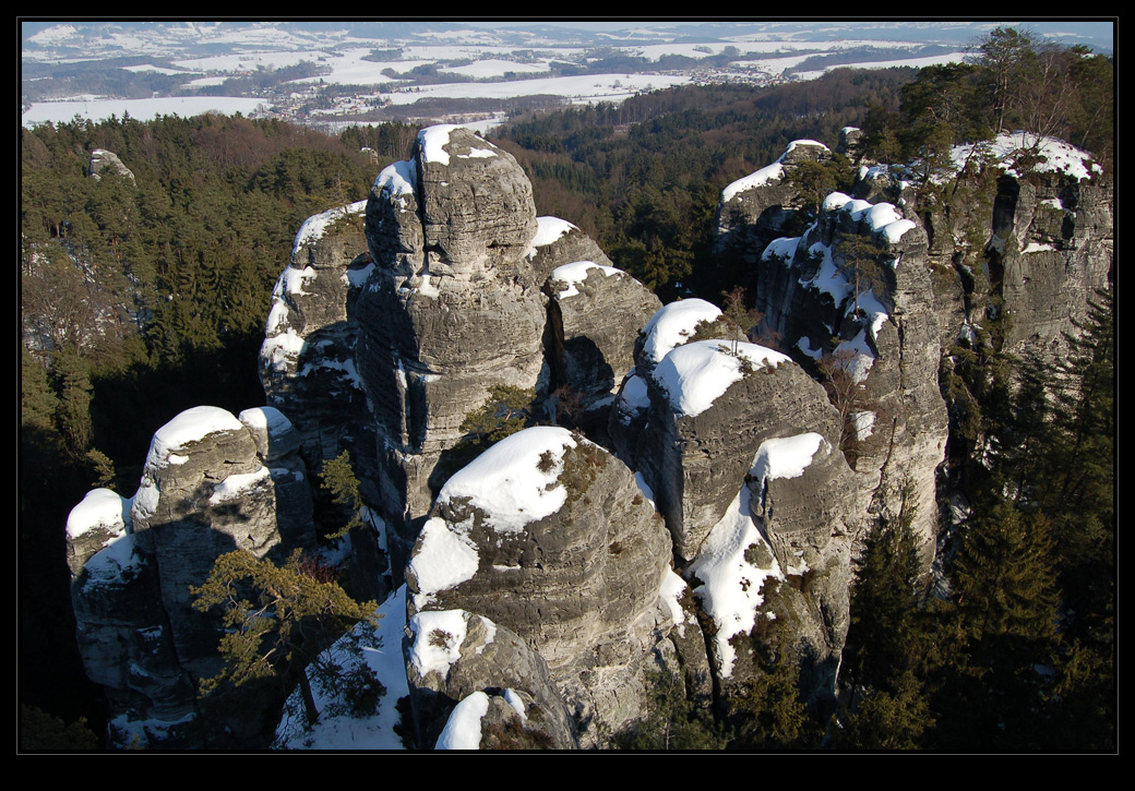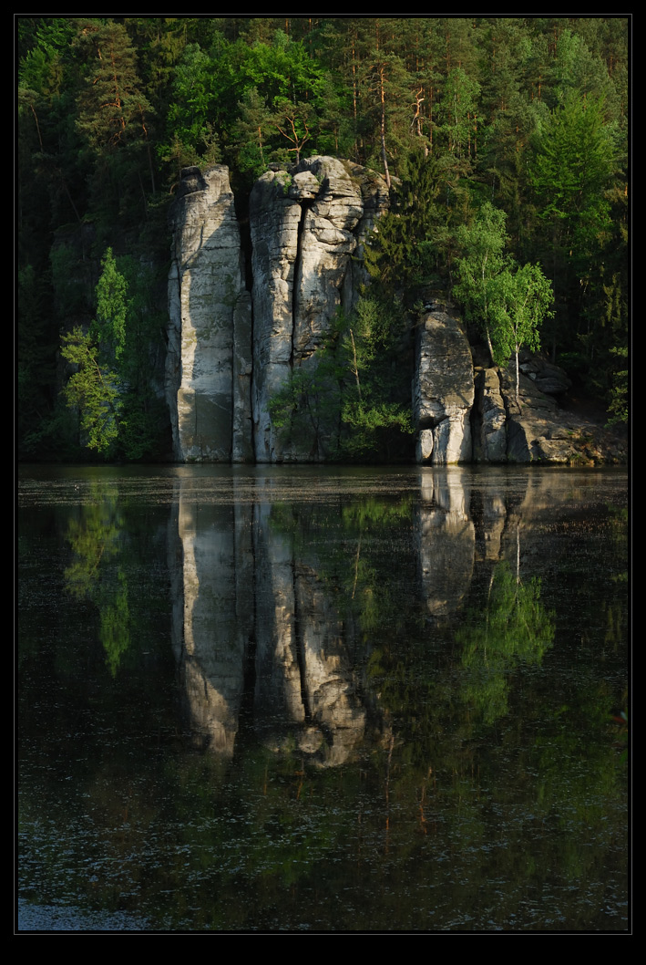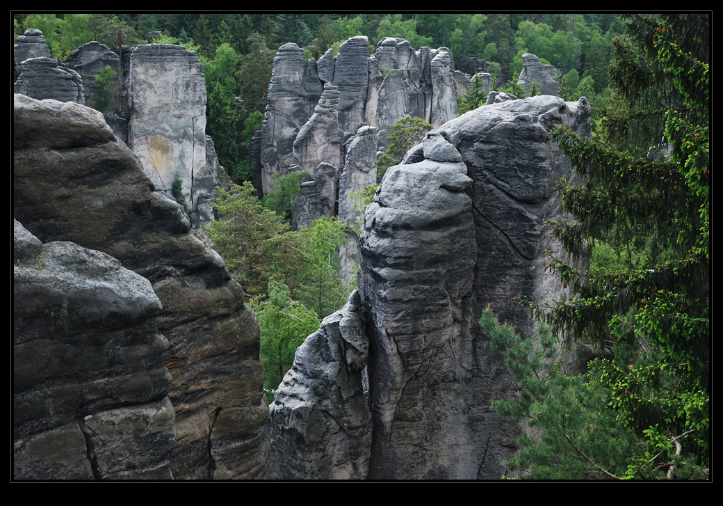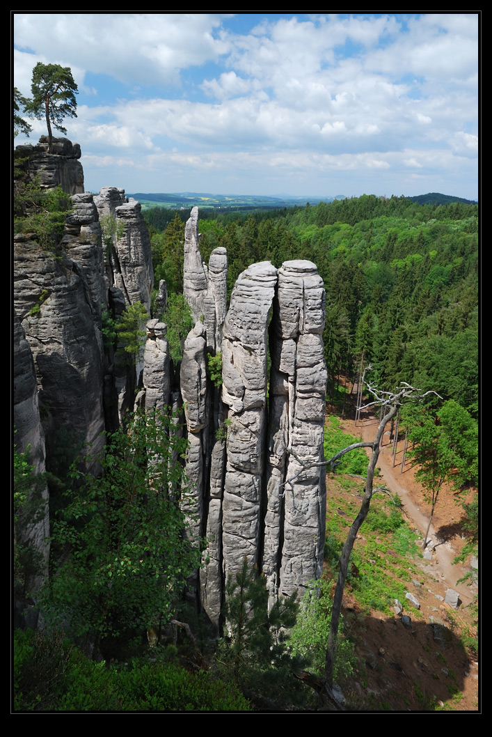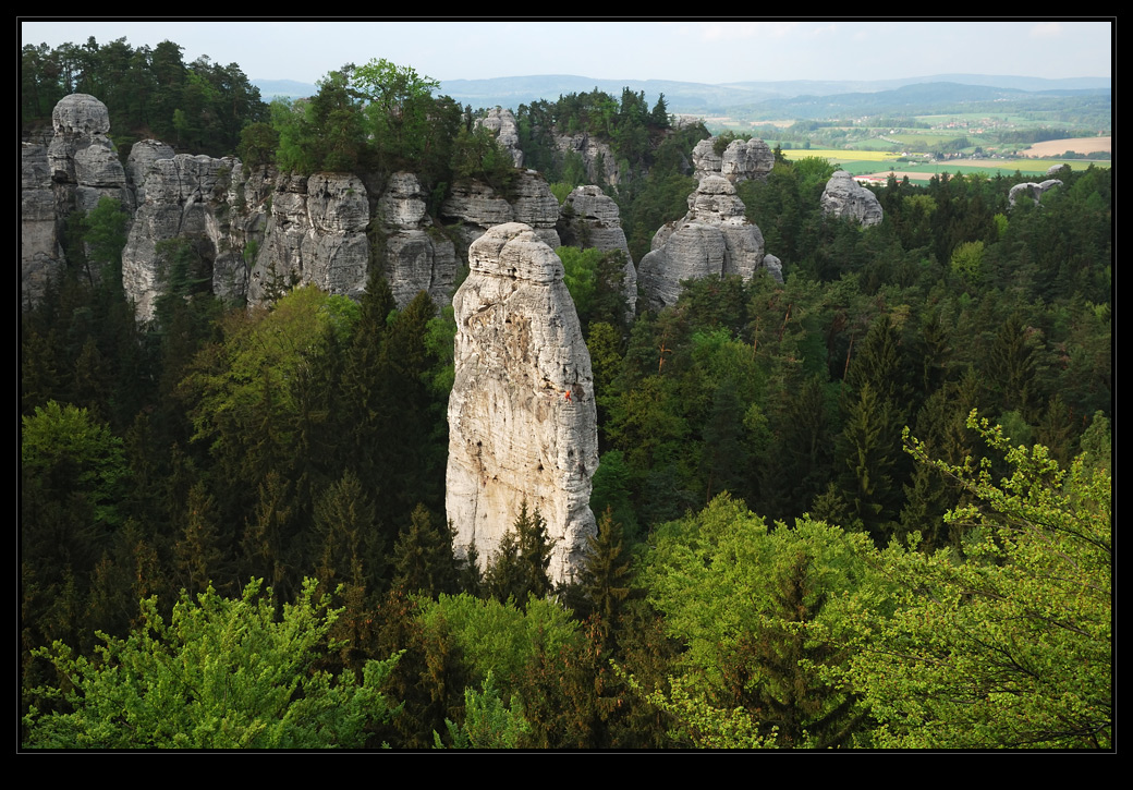 na impozantní pískovcové věže vypínající se nad hlubokými lesními